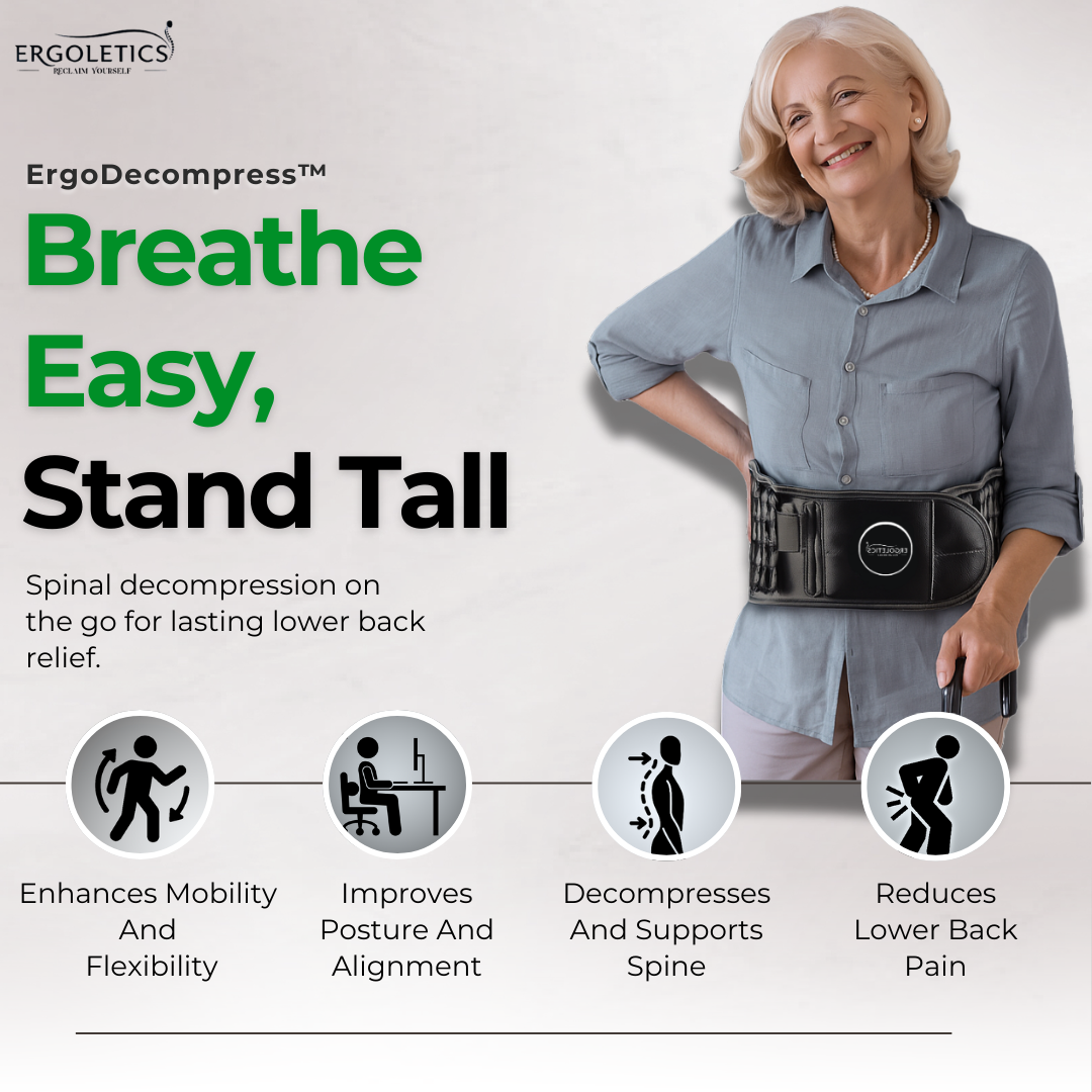 ErgoDecompress™ is a medical-grade lumbar support belt designed to relieve lower back pain through spinal decompression technology. By gently stretching the lumbar region, it alleviates pressure on intervertebral discs, improves posture, and supports mobility for daily activities.